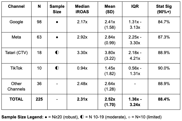 Statistical significance rates may be lower (60-75%) with less sophisticated approaches, but iROAS medians should directionally apply.